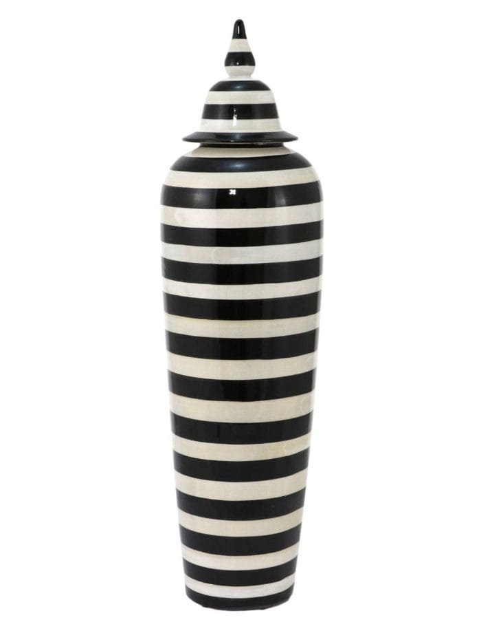 Add a contemporary and fashionable touch to your home with this lovely 24in tall ceramic jar with removable lid. This one of a kind ceramic jar made from high quality material. We love the black and white stripes all around.