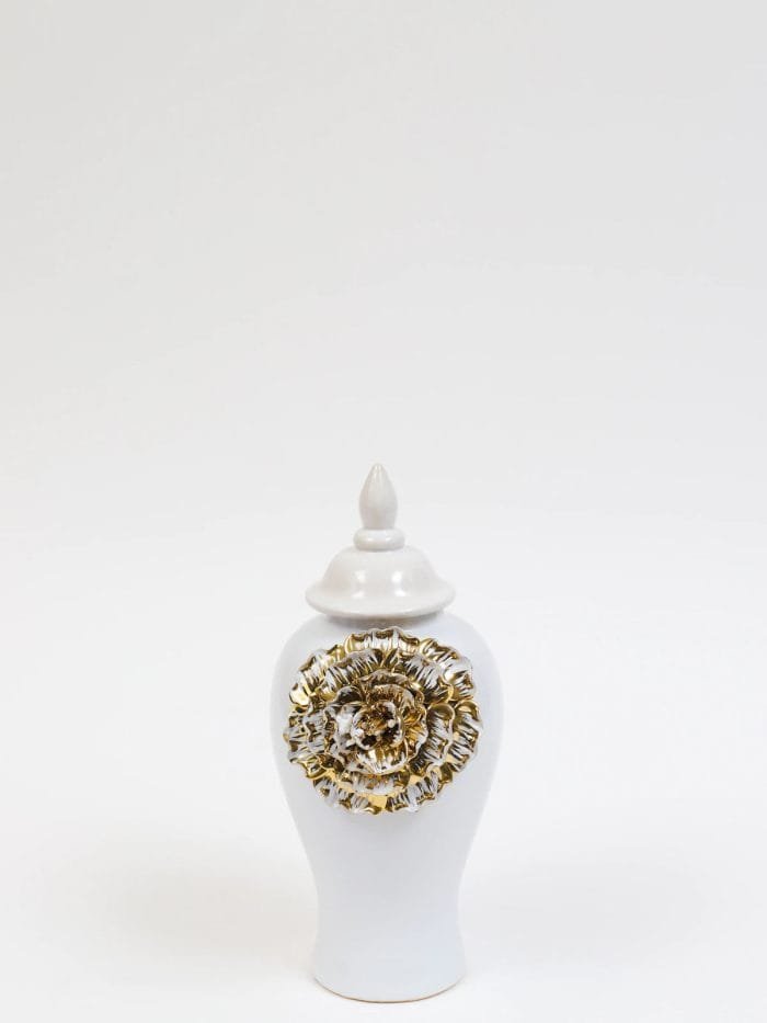The Stunning Ellarose White Ginger Jar are handmade featuring an intricate hand-shaped gold and white flower. They are perfect to style your favorite florals or to style on their own!