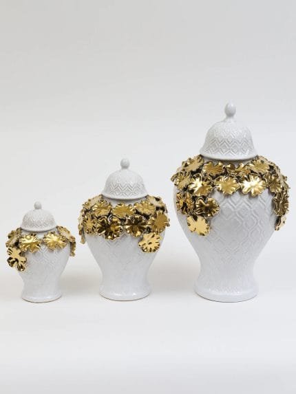 Ellarose White Ginger Jar with Large Gold Flower Detail (3 Sizes) $109.99 – $149.99