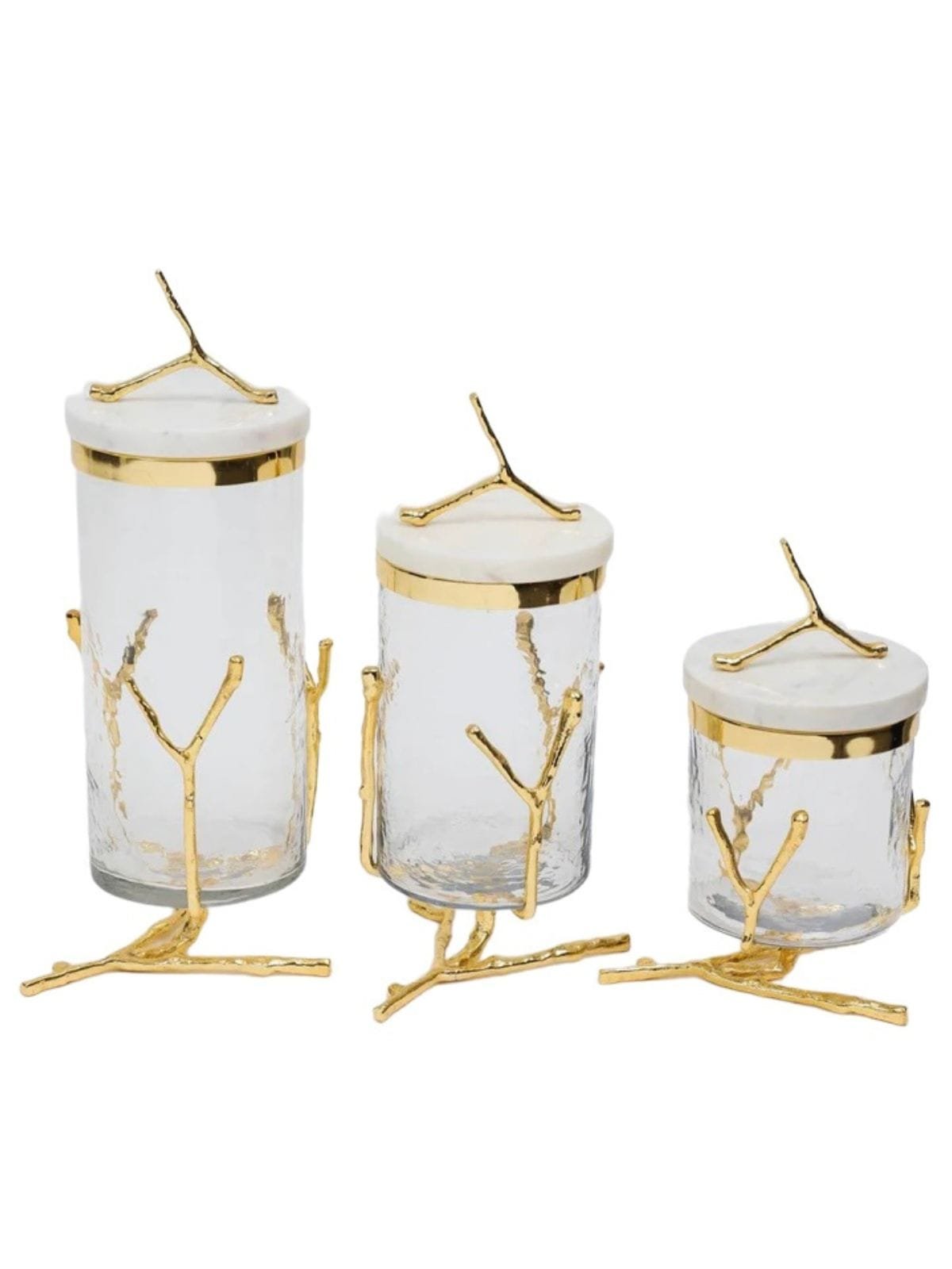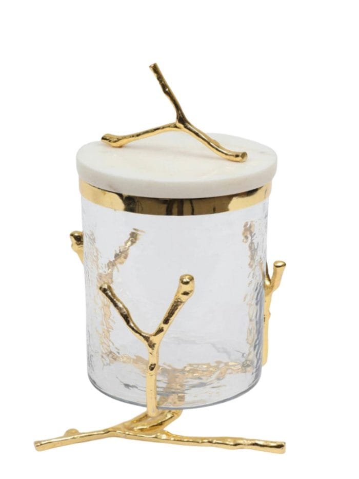 Glass Canister With Gold Twig Base and Marble Lid (3 Sizes)