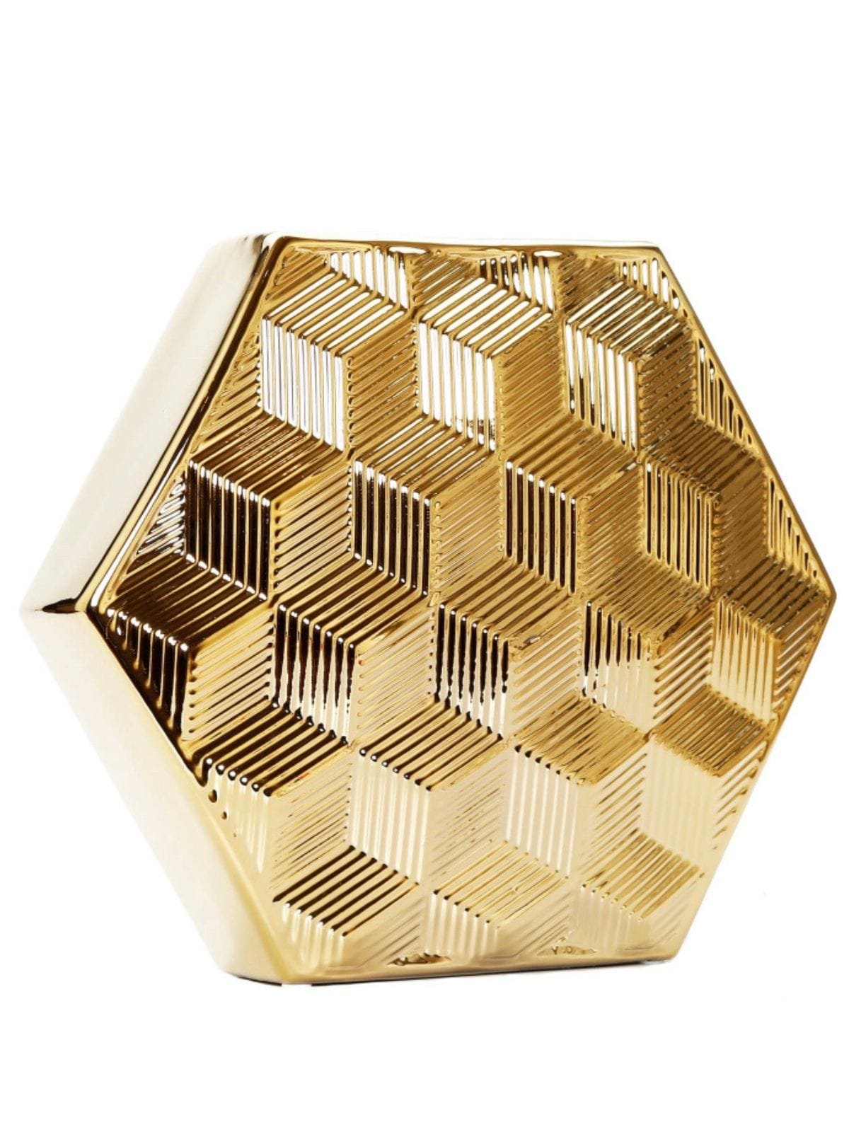 This stunning hexagon shaped ceramic vase features a bright gold color that brings elegance to any table setting.?Its rich dimensional finish will add modern sophistication to your home d??cor display.