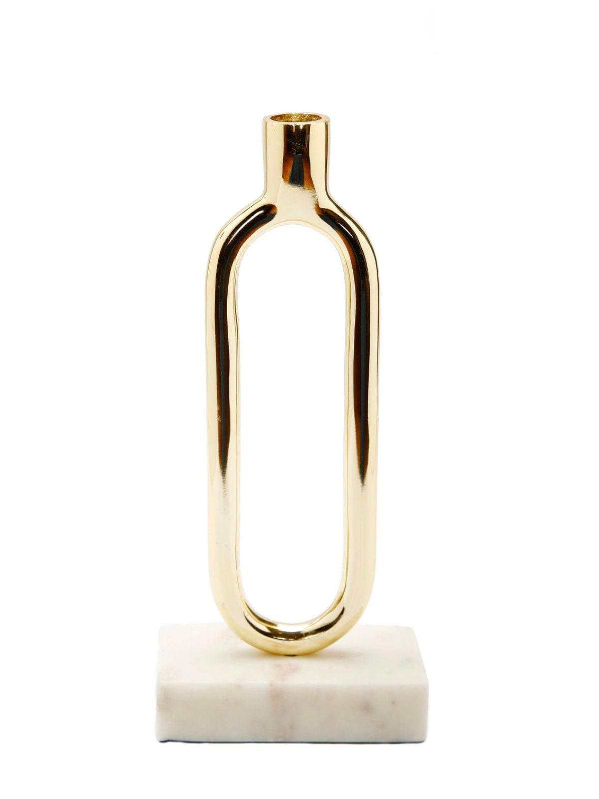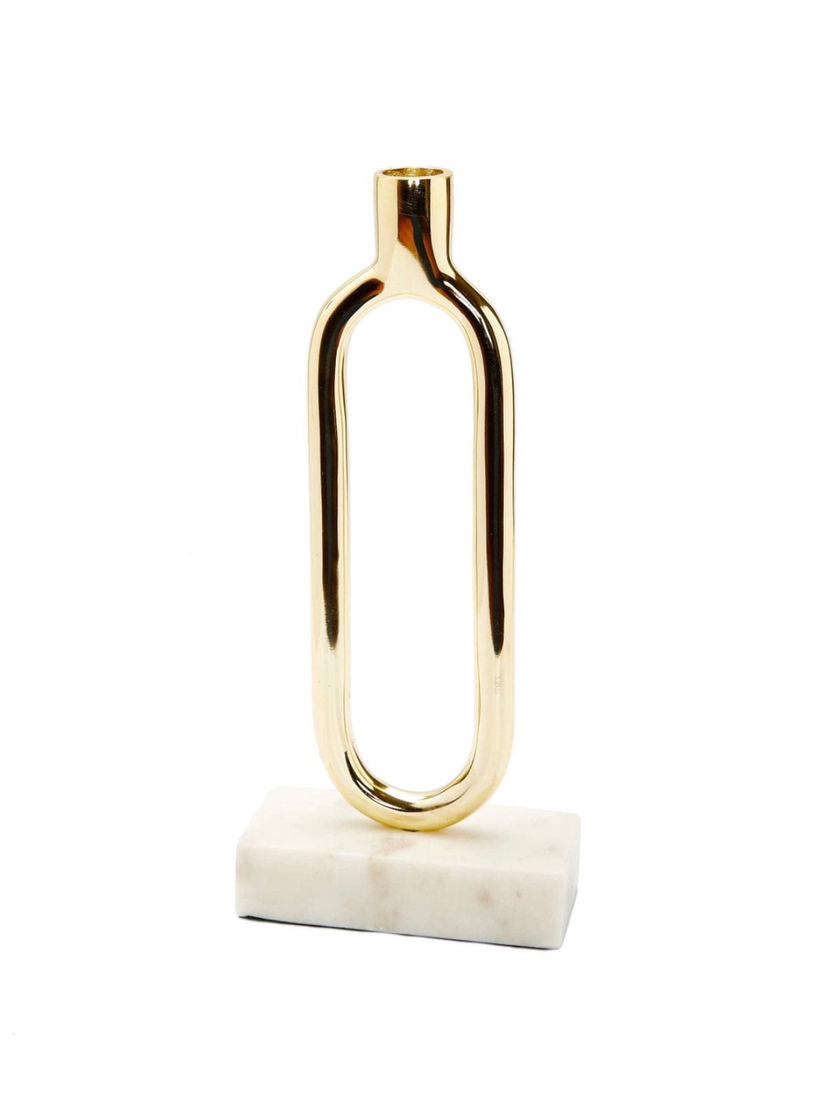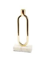 Style meets sparkle in this spectacular candle holder! Featuring glistening gold metal construction in intricate looped frame design sitting elegantly on a stunning marble base.?