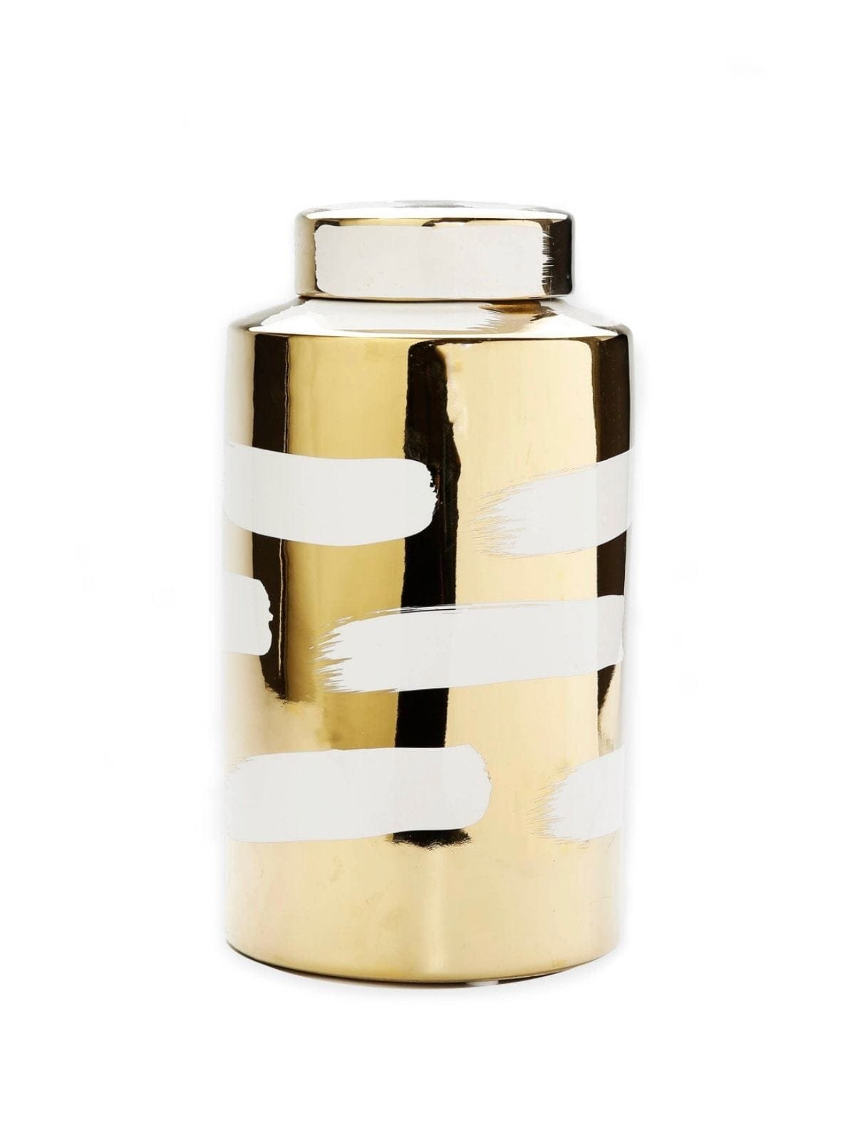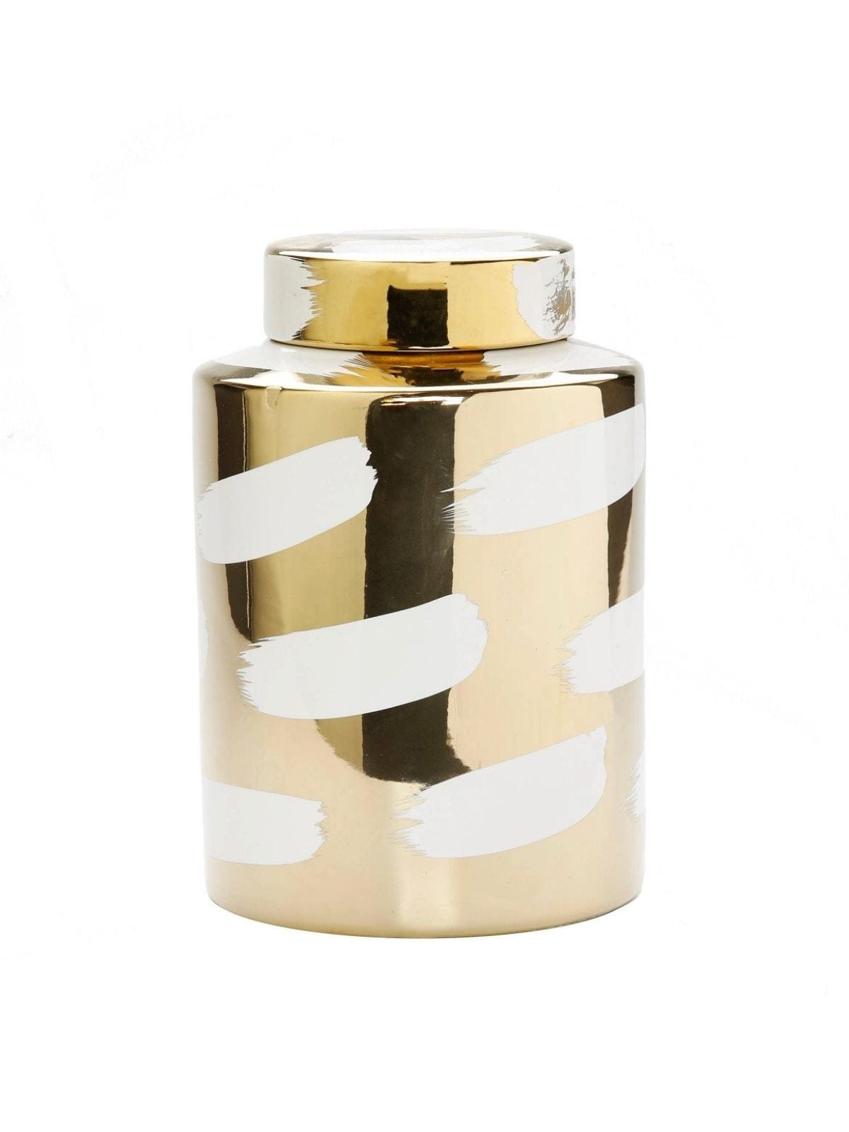 This glossy gold porcelain jar features a stunning white brushstroke design for an added touch of glam!