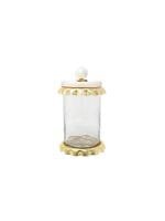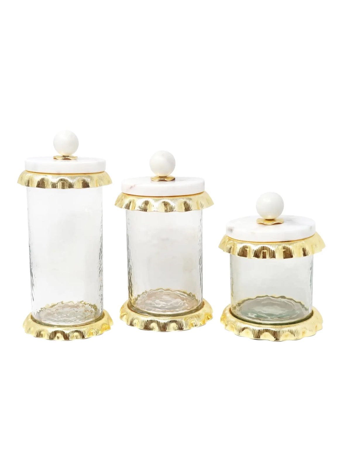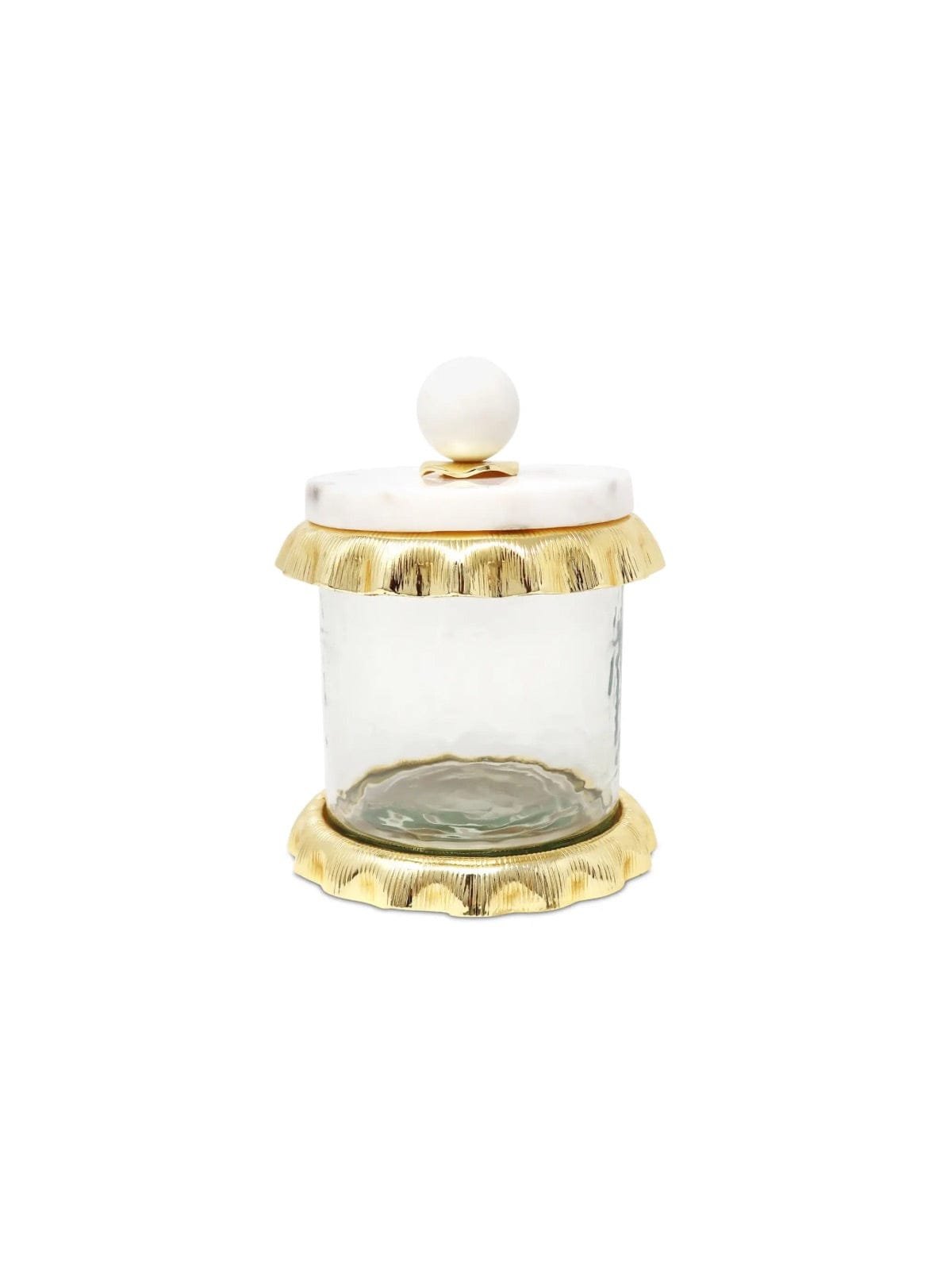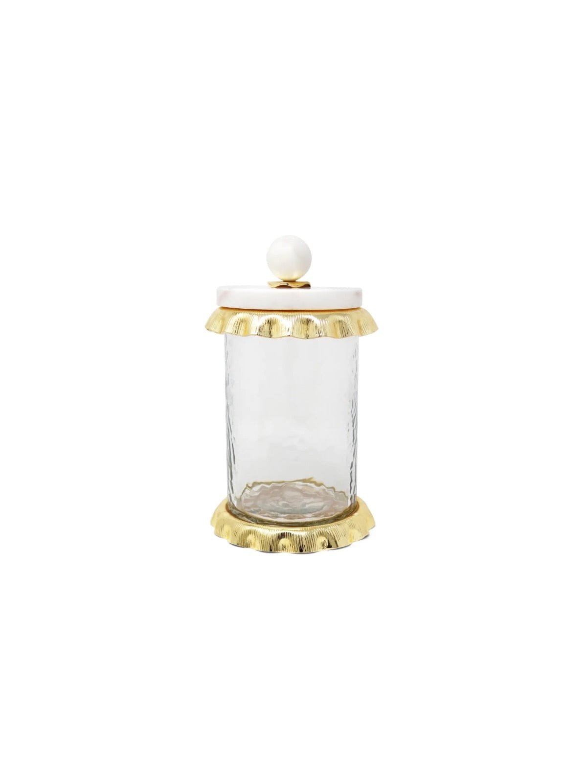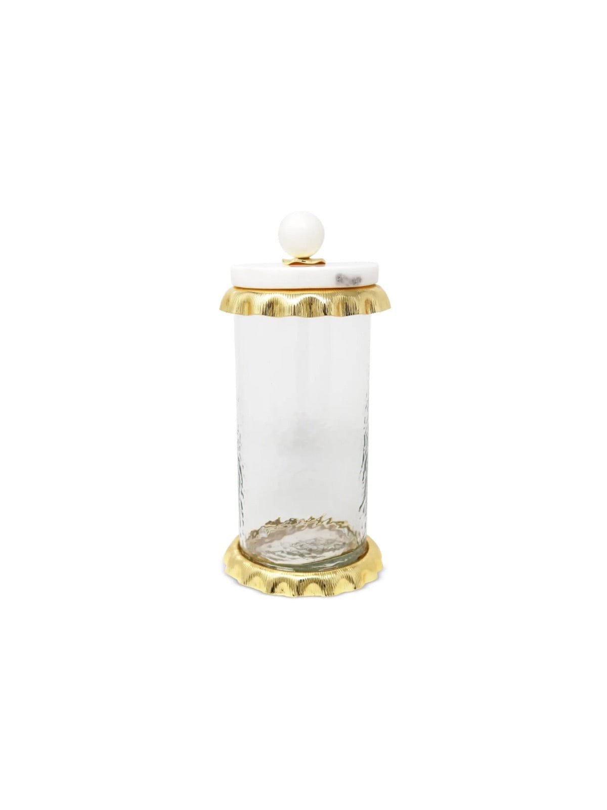This stunning canister is meticulously crafted from hammered glass. adorned with a delicate lined gold ruffle design. and crowned with a luxurious marble lid. all combining to infuse a sense of elegance into any space. This versatile canister not only serves as a functional storage solution but also allows you to showcase your collections or kitchen essentials in style. With its unique design features. it stands as an ideal statement piece that can enhance the aesthetics of any home.