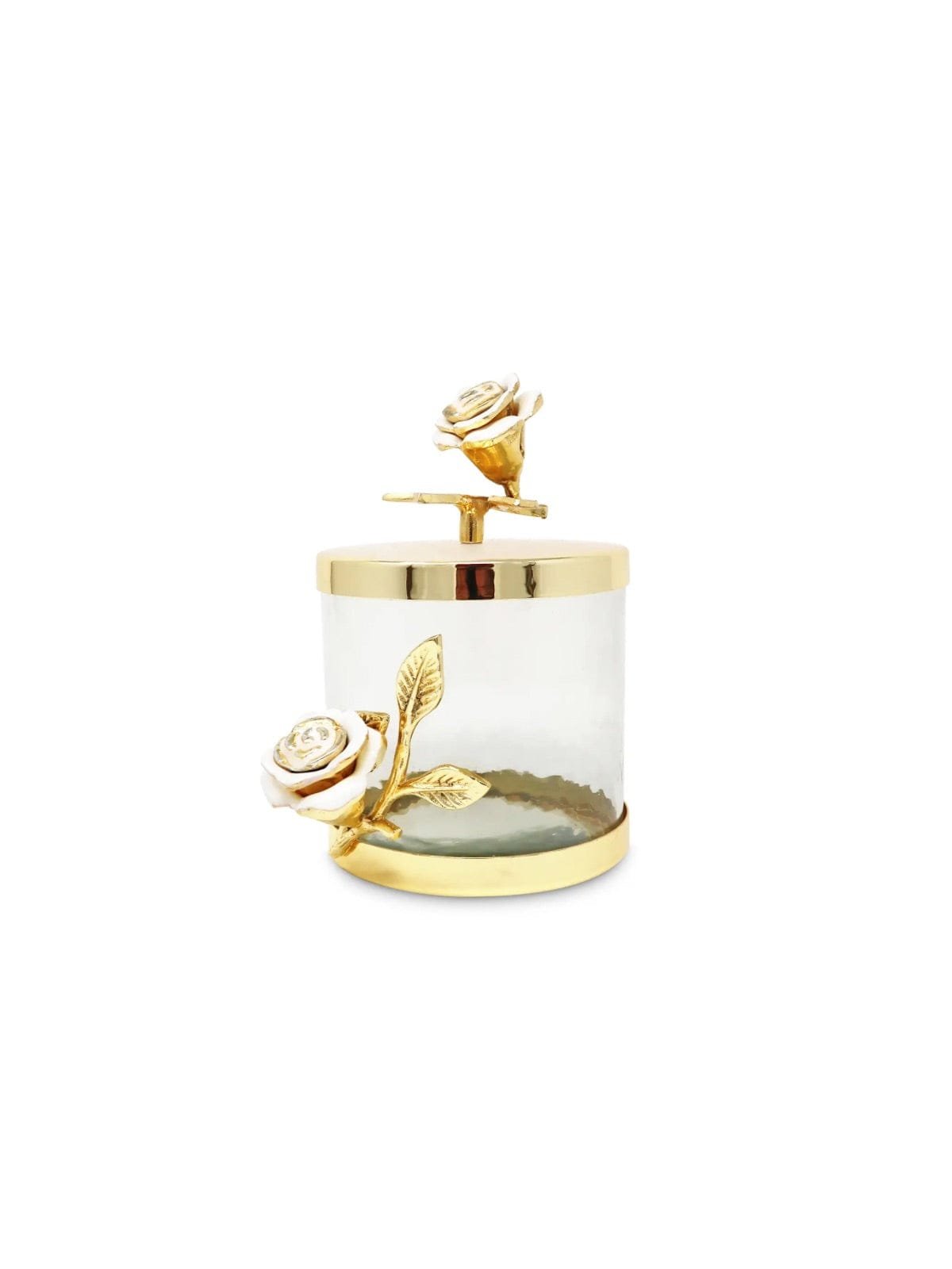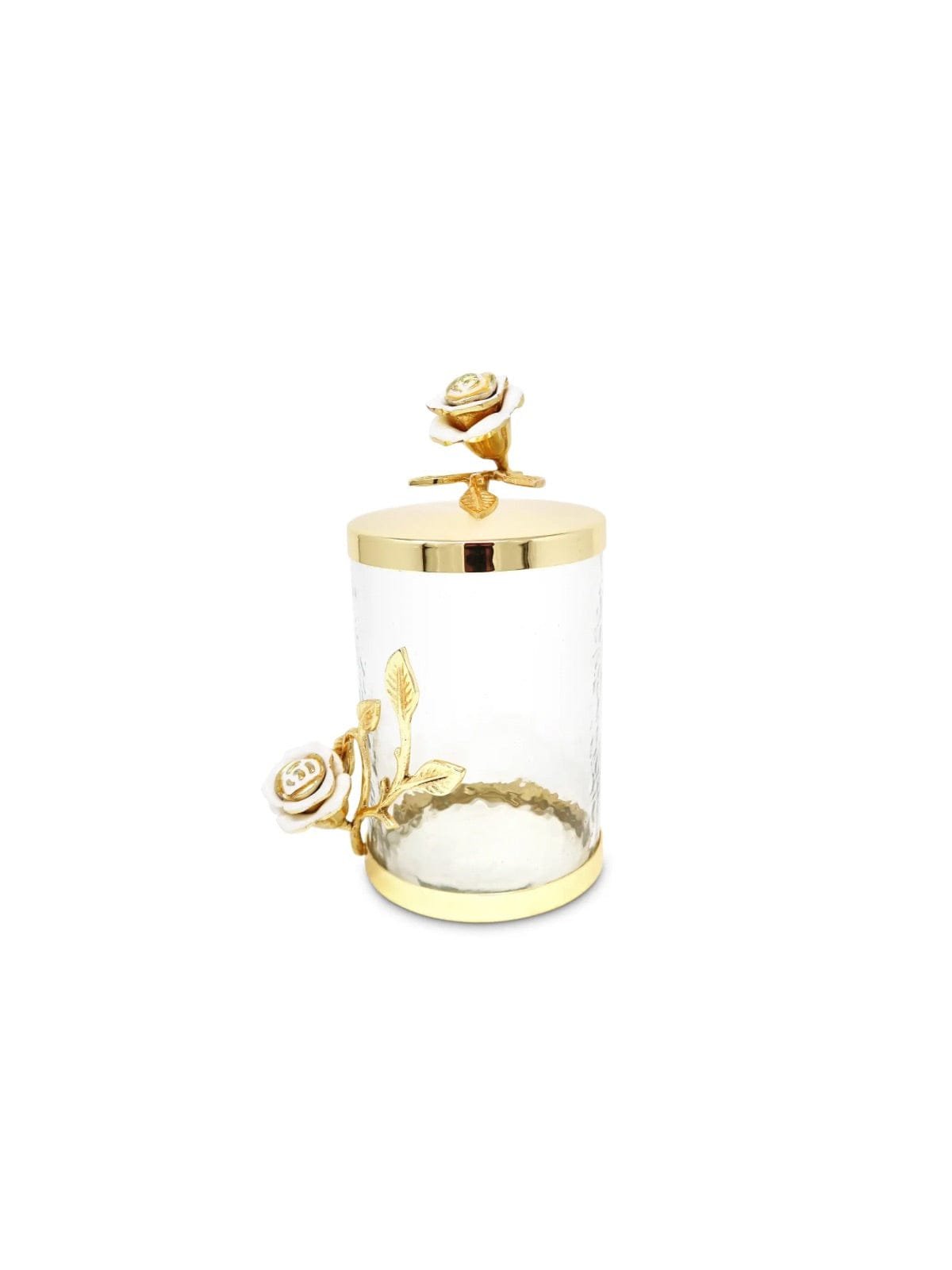 Enhance your kitchen with vintage charm using this hammered glass canister featuring an elegant white and gold rose design and a sleek stainless steel gold lid. This canister not only brings a touch of luxury to your pantry or countertop but also ensures the safety and freshness of your food items.