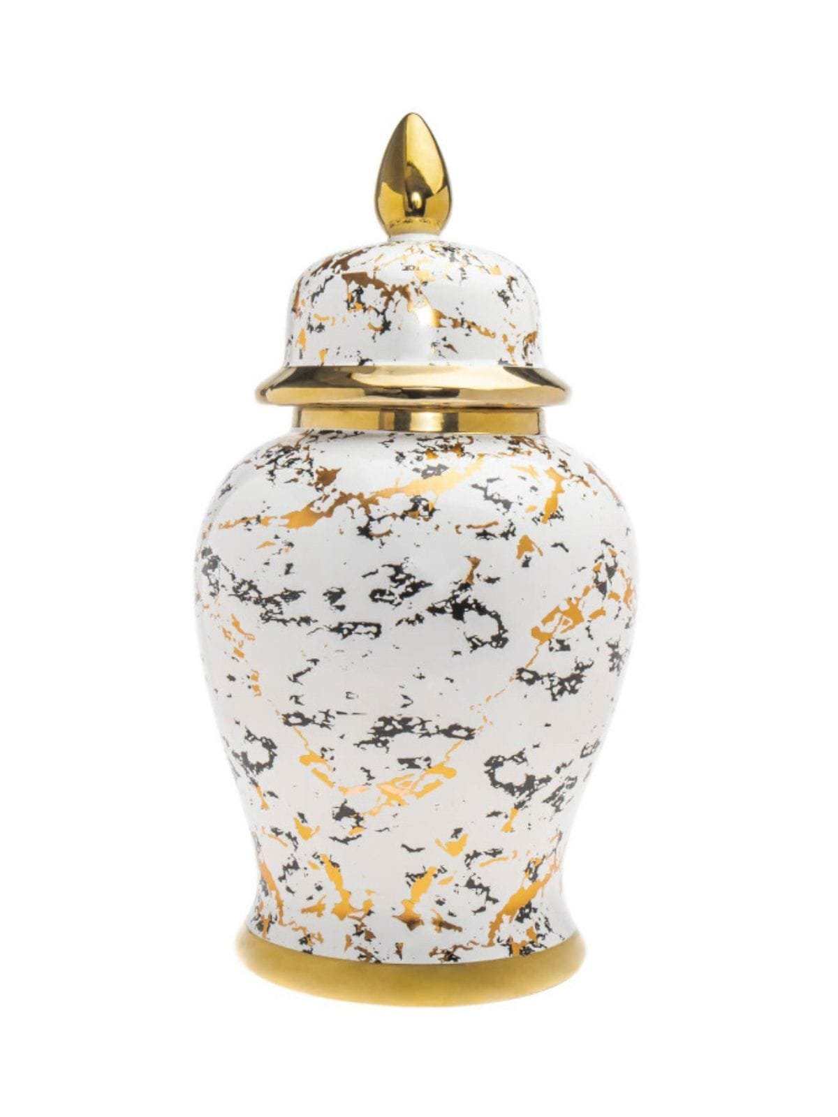 This Marble Print Ginger Jar has an exotic look with an?elegant gold-tone finial rim and base.?This gorgeous ginger jar will look stunning on its own or filled with your favorite faux florals.
