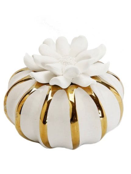 This lovely scent diffuser comes in a gorgeous polish gold porcelain round bottle with a white floral topper that wicks and diffuses the fruity fragrance of English Pears and and Freesia.?This English?Pears and?Freesia scent combines the freshness of sweet pears. wrapped in a bouquet of white freesias. imbuing a cool and calm spirit.