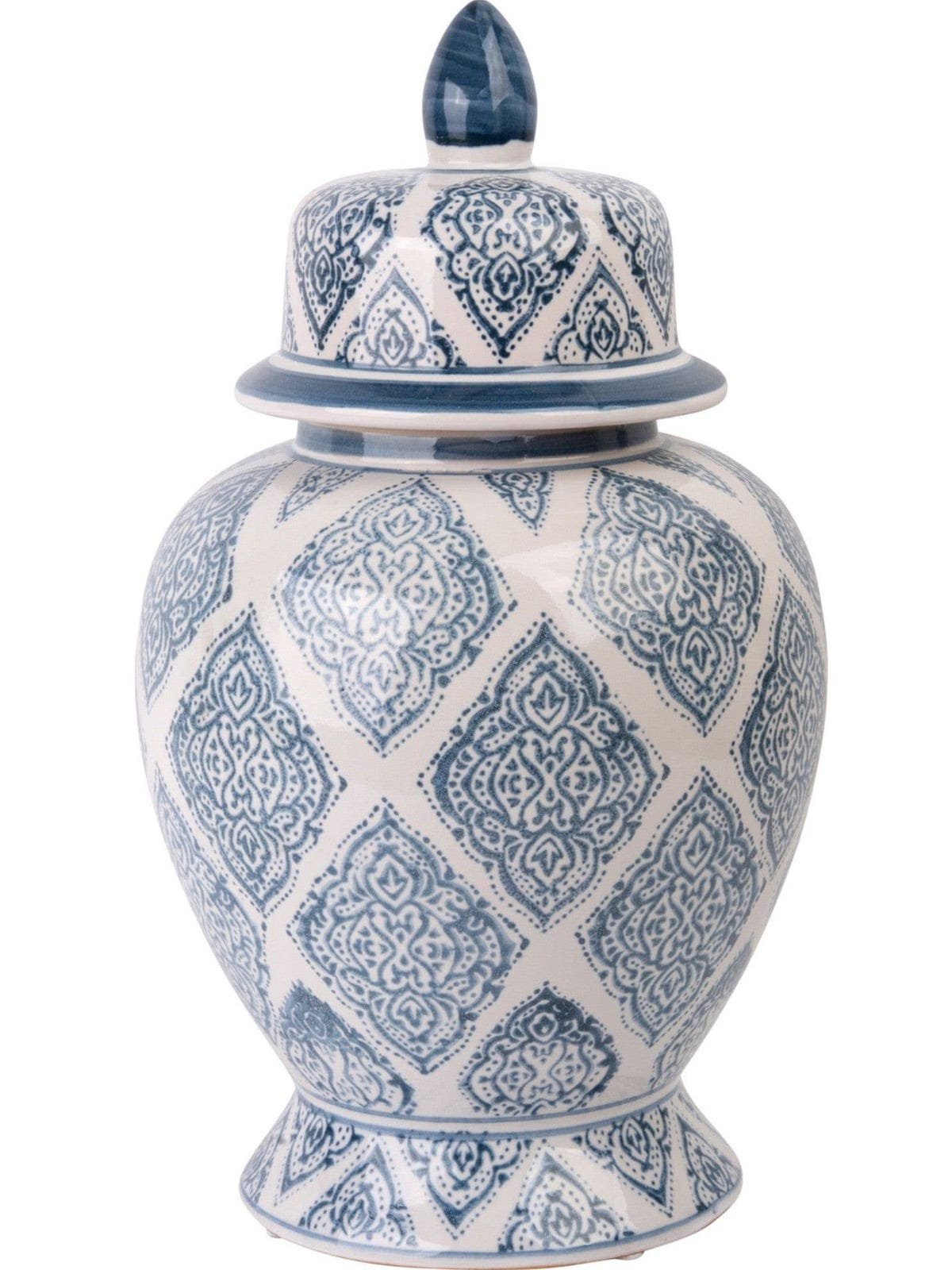 Dare to decorate boldly with this striking White and Gray Blue Ginger Jar with Lid. Instantly add style and luxury to your space with this one-of-a-kind ceramic jar. Make a statement and take your room to the next level!