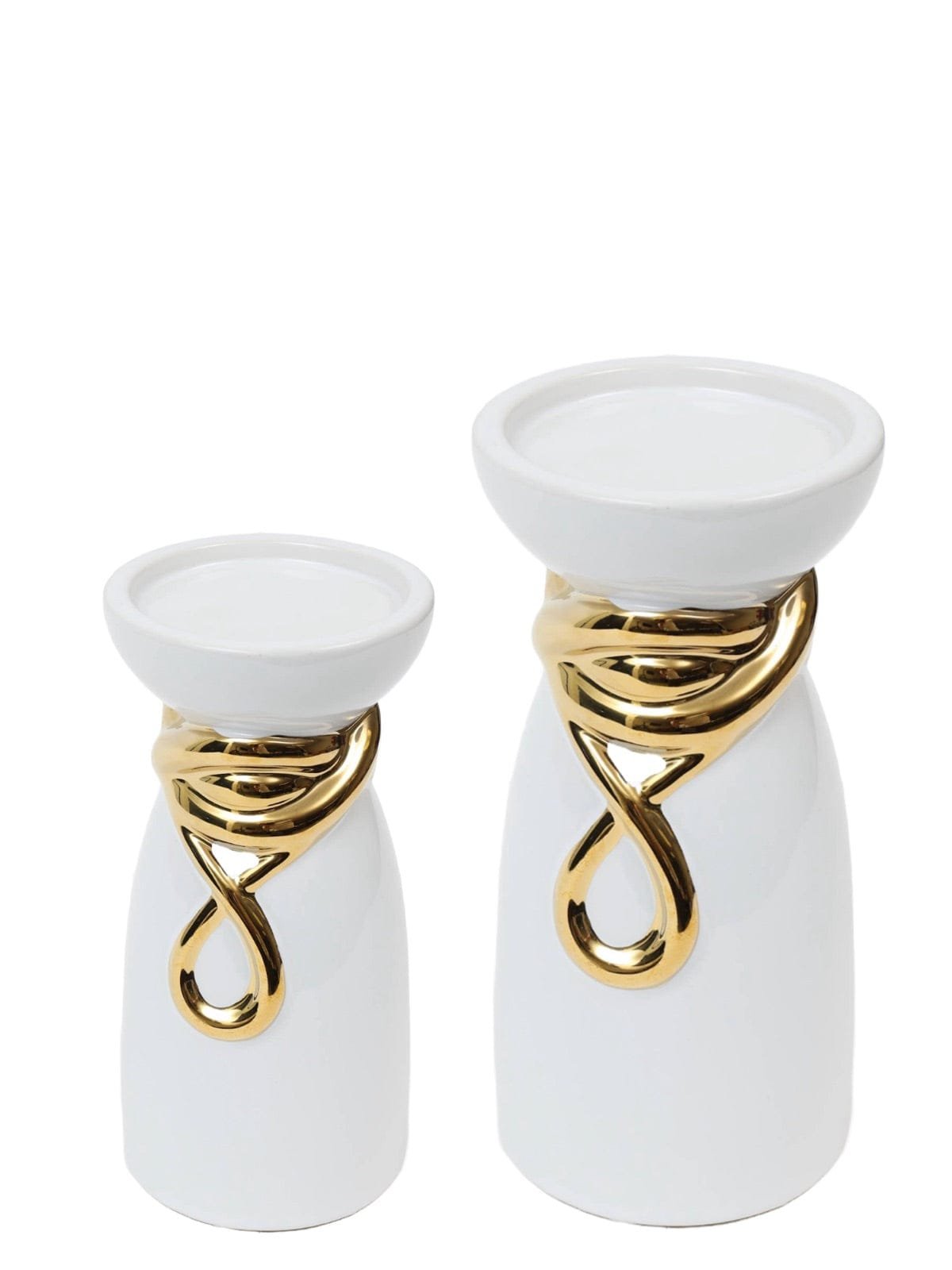 Home Candle Holders and Accessories White Ceramic Candle Holder with Gold Ribbon Design (2 Sizes)