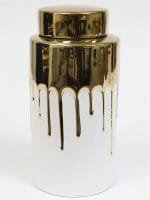 These white ceramic jars and gold cover have such a beautiful and unique style! Its rich gold drip design will add an elegant touch to your home d??cor display.?