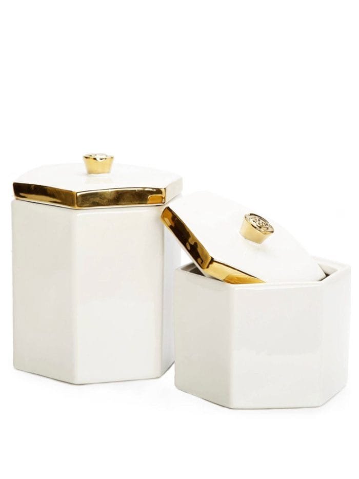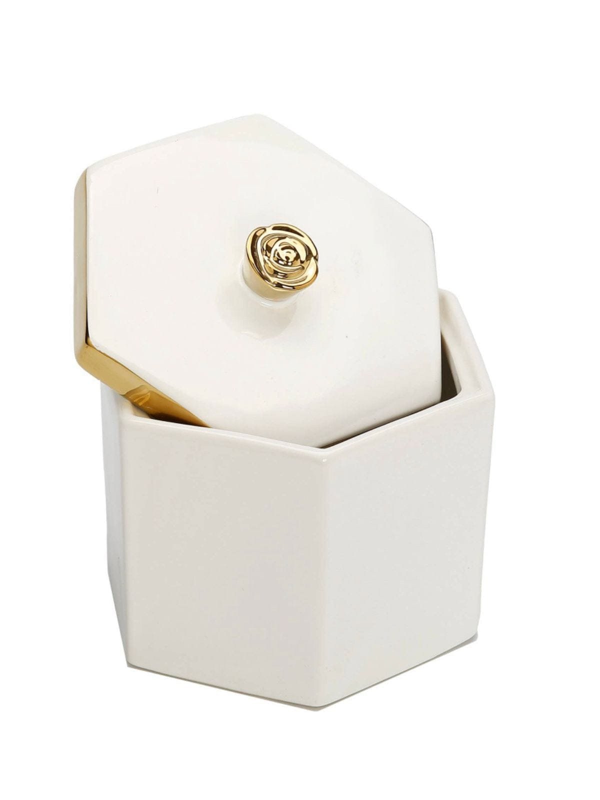 These White Hexagon Shaped Jar with Gold Flower ?Knob on Cover Can be placed?in the bathroom. bedroom or kitchen. A perfect place to jewelry or condiments. Leave it by the sink to collect your rings as you wash your hands or display it in your bathroom as a beautiful decor?