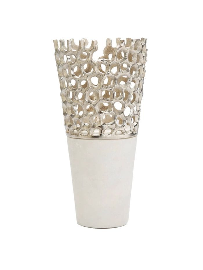This web cut-out design vase has a substantial marble base and will look gorgeous with your favorite faux florals.